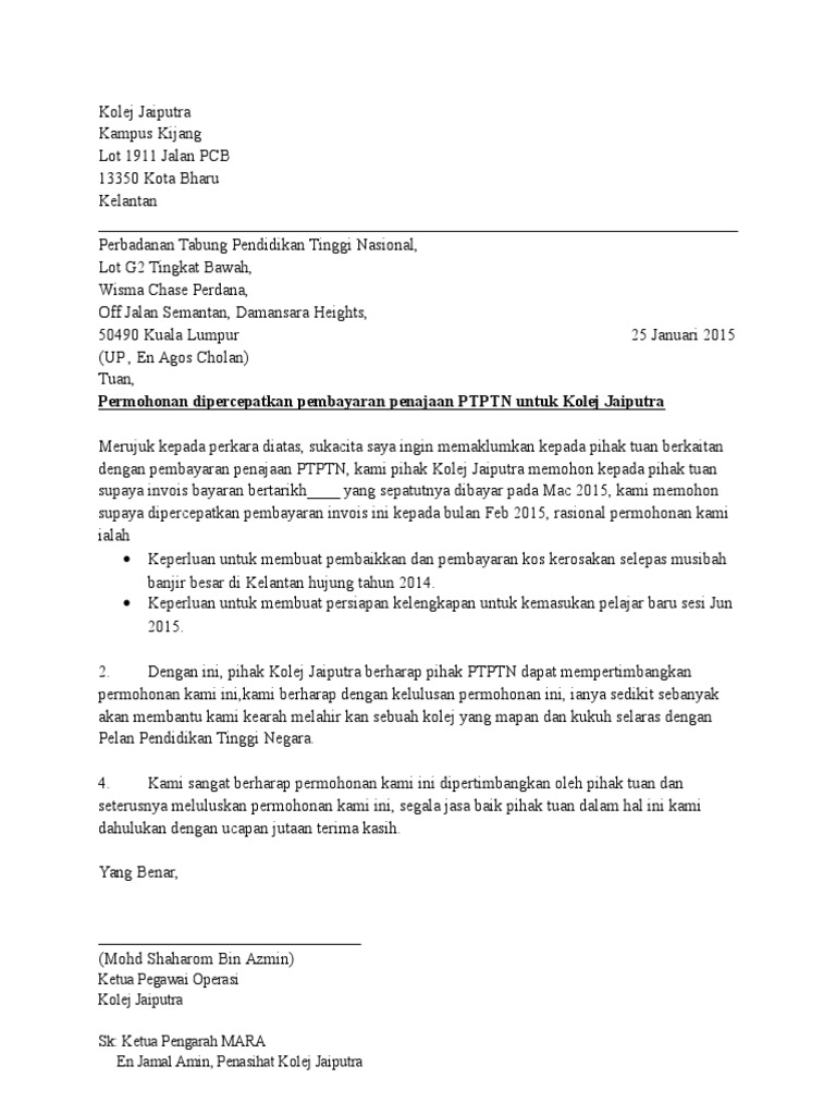 Contoh Surat Rayuan Ptptn Permohonan Pinjaman
